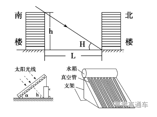 ⑤计算楼间距:为了保证一楼全年有阳光照到,北回归线以北地区建楼房时,两楼之间的最短距离应大于L=h*cotH(H:冬至日正午太阳高度)