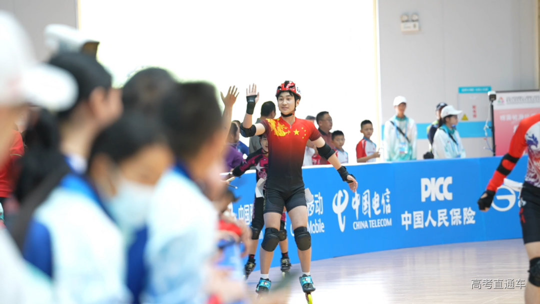 在全国第十二届残疾人运动会暨第九届特殊奥林匹克运动会的轮滑比赛现场,中国教育电视台记者拍摄自闭症运动员完赛后与教练击掌的画面。