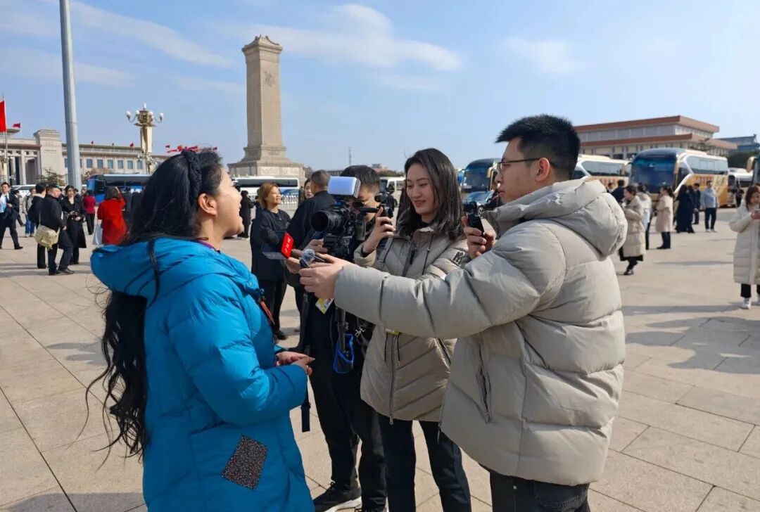 2025年全国两会期间,中国教育电视台记者在天安门广场采访全国政协委员。