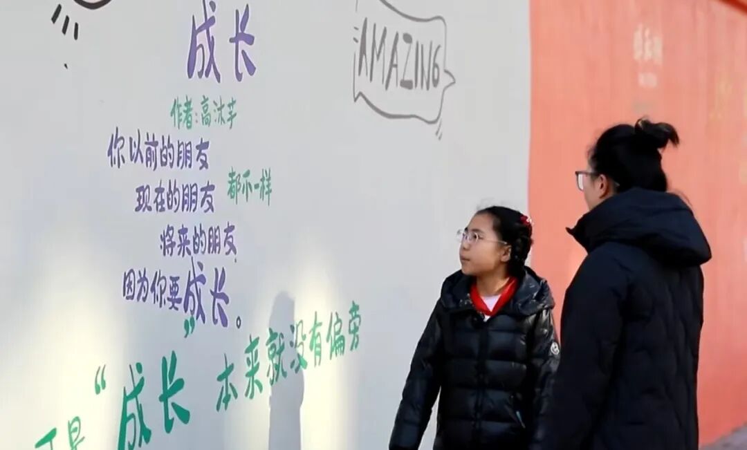 中国教育电视台记者在北京十一学校丰台小学门前的“彩色学安路”,采访参与“马路诗歌节”的学生。