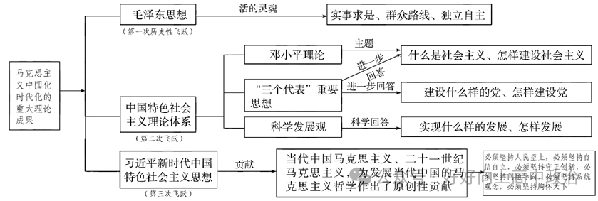 7、哲学史上的“两个对子”:唯物主义与唯心主义、辩证法与形而上学。(P11)(1)阶级基础:无产阶级的产生和发展。马克思主义哲学是无产阶级反对资产阶级、争取自由解放斗争的必然产物。(2)直接理论来源:德国古典哲学,其中主要是黑格尔的辩证法和费尔巴哈的唯物主义。(3)自然科学前提:细胞学说、能量守恒和转化定律、生物进化论这三大发现和自然科学的其他巨大进步。(4)社会科学前提:英国古典政治经济学、英法空想社会主义学说等取得的积极成果。9、马克思主义的重要性:马克思主义是科学的理论、人民的理论。它创造性地揭示了人类社会发展规律,第一次站在人民的立场探求人类自由解放的道路,为最终建立一个没有压迫、没有剥削、人人平等、人人自由的理想社会指明了方向。(P12)10、★马克思主义哲学的历史使命:实现无产阶级和全人类的解放。(P12)11、★马克思主义哲学的基本特征(P13-P14)①实践观点是马克思主义哲学的核心观点。马克思主义哲学第一次在科学的基础上实现了唯物主义与辩证法的有机结合,实现了唯物辩证的自然观与历史观的统一。②马克思主义哲学实现了实践基础上的科学性和革命性的统一。12、马克思主义中国化时代化的重大理论成果(P15-P16)