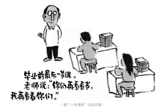 然而,今年却让大家有扑空的感觉。这个题目的难度,在于大大地出乎了备考师生的预料。但如果从跳空感中镇定下来,会发现,这其实是一个操作性很强的题目。它对于考生来说,应该是有共情感的。做好这个题目的关键,在于好好理解:“毕业前的最后一节课”,以及“你们再看看书,我再看看你们”之间的关系。这其中的意味,不同的人会有不同的理解,自拟题目,初级的,可以写成看图说话类型的场景还原,文笔通顺地把场景再现了,基本就算完成了。也可从师生情义的角度,生发开了写,只要注意挖掘这段话中的不舍与关怀;还可从高考的情怀角度,写高中三年的生活,以及最后一课的情绪描述;也可从“你看风景,我看你”的角度,写不同的情感与不同的关注点之类的哲学视角问题。