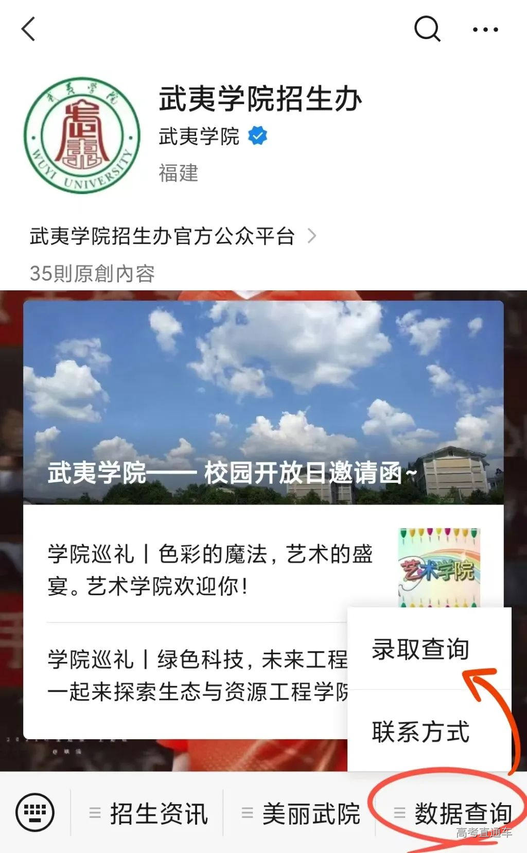 或关注“武夷学院招生办”微信公众号,在右下方菜单栏“数据查询”板块,点击“录取查询”,输入考生号和姓名即可查询。