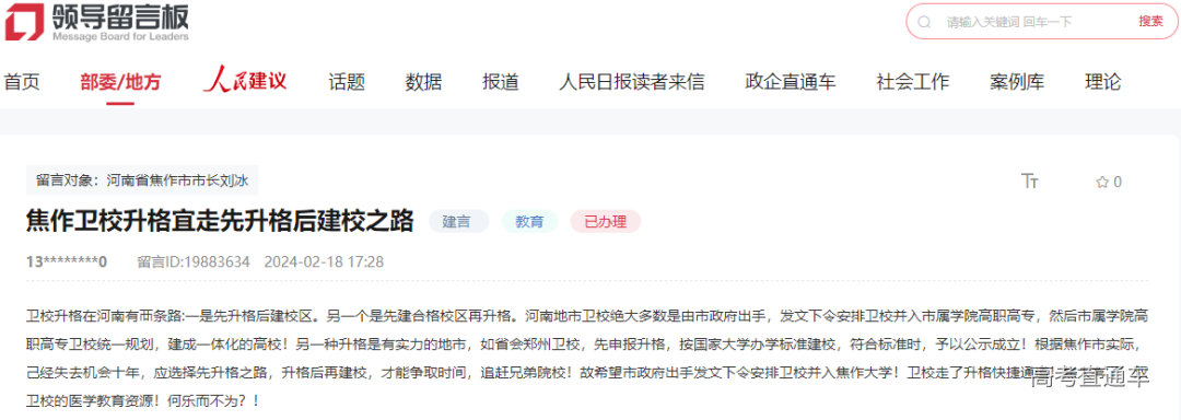日前,有网友在人民网领导留言板提出“将焦作市医药卫生学校并入焦作大学”的建议,对此,河南省焦作市回复组称:焦作卫校并入焦作大学暂时未纳入河南省高等学校“十四五”规划。目前,按照省教育厅要求并结合实际,焦作市正在积极推进焦作医药职业学院设置工作。