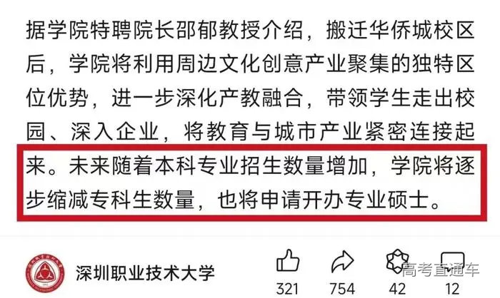 据学院特聘院长邵郁教授介绍,搬迁华侨城校区后,学院将利用周边文化创意产业聚集的独特区位优势,进一步深化产教融合,带领学生走出校园、深入企业,将教育与城市产业紧密连接起来。未来随着本科专业招生数量增加,学院将逐步缩减专科生数量,也将申请开办专业硕士。