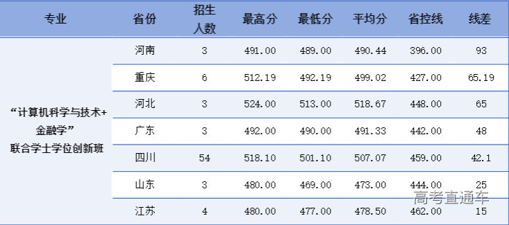 我校联合西南财经大学天府学院,发挥各自的学科专业优势,开设了“计算机科学与技术+金融学”联合学士学位创新班,该创新班2024年在全国七个省份计划招生76人(两校各76人,共152人),各省录取情况如下: