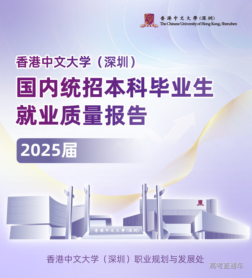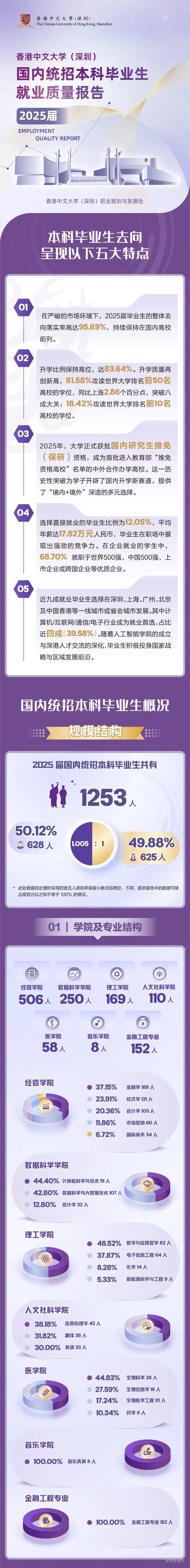 香港中文大学(深圳)2025届 国内统招本科生毕业去向的五大特色 在严峻的市场环境下,2025届毕业生的整体去向落实率高达95.69%,持续保持在国内高校前列。 升学比例保持高位,达83.64%。升学质量再创新高,81.58%攻读世界大学排名前50名高校的学位,同比上涨2.86个百分点,突破八成大关;18.42%攻读世界大学排名前10名高校的学位。 2025年,大学正式获批国内研究生推免(保研)资格,成为首批进入教育部“推免资格高校”名单的中外合作办学高校。这一历史性突破为学子开辟了国内升学新赛道,提供了“境内+境外”深造的多元选择。 选择直接就业的毕业生比例为12.05%,平均年薪达17.82万元人民币,毕业生在职场中展现出强劲的竞争力。在企业就业的学生中,68.70%就职于世界500强、中国500强、上市企业或跨国企业等优质企业。 近九成就业毕业生选择在深圳、上海、广州、北京及中国香港等一线城市或省会城市发展。其中计算机/互联网/通信/电子行业成为就业首选,占比近四成(39.58%)。随着人工智能学院的成立与深港人才交流的深化,毕业生积极投身国家战略与区域发展前沿。 ✦ • ✦ 名校云集,学术新星闪耀 2025届国内统招本科毕业生的升学比例为83.64%。在全球高等教育竞争加剧的背景下,港中大(深圳)学子凭借扎实的学术功底与国际化视野,持续获得全球顶尖学府的青睐。 升学质量“双突破”:根据2026年QS世界大学排名/2025年US.NEWS世界大学排名,81.58%的升学毕业生攻读世界大学排名前50名高校的学位,18.42%攻读世界大学排名前10名高校的学位。录取院校涵盖麻省理工学院、斯坦福大学、哈佛大学、牛津大学、剑桥大学、帝国理工学院、新加坡国立大学、苏黎世联邦理工大学等世界学术殿堂。 升学版图更加多元:在升学目的地的选择上,美国(28.91%)和中国香港(27.48%)为主要升学目的地,其中赴港深造比例同比上涨8.39个百分点。此外,中国内地、英国及新加坡也成为重要选择。 直博比例稳步提升:本届毕业生中共有71人直接攻读博士学位,占升学人数的6.77%,同比增长1.11个百分点。他们获得了包括牛津大学工程科学、新加坡国立大学计算机科学、加州大学伯克利分校计算机科学等全额奖学金博士录取,这些学术新星正以坚定的信念,迈向学术前沿。 ✦ • ✦ 职场绽放,菁英未来可期 在2025届毕业生中,共有151人选择直接就业。他们在激烈的职场竞争中脱颖而出,平均年薪达到17.82万元,薪酬结构进一步优化,展现了卓越的市场价值。 头部企业青睐有加:毕业生就业含金量高,在企业就职的毕业生中,68.70%入职世界500强、中国500强、上市企业或跨国企业。腾讯、华为、京东、美团、宝洁、摩根大通、花旗银行、德勤等行业巨头成为毕业生的主要去向。雇主调研显示,企业对港中大(深圳)学子的业务能力、外语水平、创新意识及职业道德给予了高度评价。 行业选择顺应发展:从行业分布来看,39.58%的毕业生投身计算机/互联网/通信/电子行业,同比增加9.73个百分点。这充分体现了大学学科布局与国家数字经济、人工智能发展战略的高度契合。 扎根湾区服务国家:就业地点上,55.56%的毕业生选择留在深圳,近九成分布在北上广深及中国香港等一线城市或省会城市发展。随着深港融合发展的加速,越来越多的毕业生利用“IANG签证”扩容机遇赴港就业,成为大湾区建设的生力军。 ✦ • ✦ 2025届毕业生以卓越的表现展示了香港中文大学(深圳)在人才培养方面的非凡实力。从名校录取到高质量就业,从获批推免资格到AI时代的顺势而为,毕业生用行动证明了自己在国际化教育体系中脱颖而出的竞争力。 面对未来的机遇与变革,正如徐扬生校长在毕业典礼上所言:“人生就像爬山,顶峰不重要,重要的是脚踏实地走好每一步。” 徐校长寄语同学们,在这个强调“智能”的时代,更要珍视“勇敢”,敢于去冒风险,做一些大胆的尝试;在压力面前保持“韧性”,练就强大的内心;在选择面前,要明白 “做正确的事” 比 “正确地做事” 重要得多。 祝愿香港中文大学(深圳)2025届毕业生在人生新征程中,仰望星空,脚踏实地,带着母校的祝福,去书写属于你们的辉煌篇章! 浏览下方长图 5分钟带你了解 港中大(深圳)2025届国内统招本科生 毕业去向情况