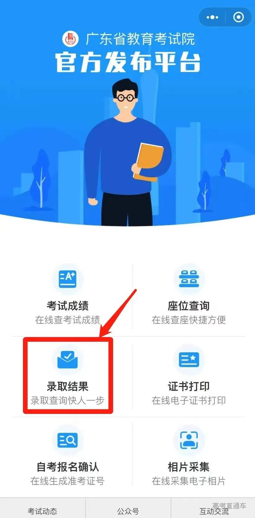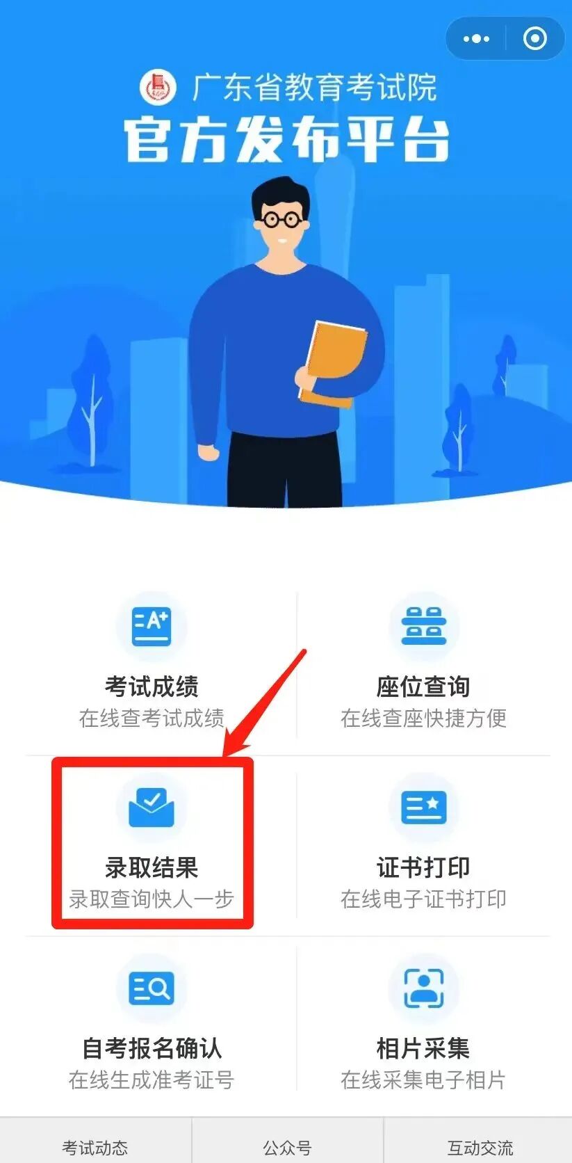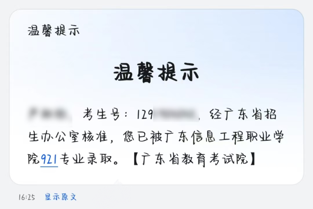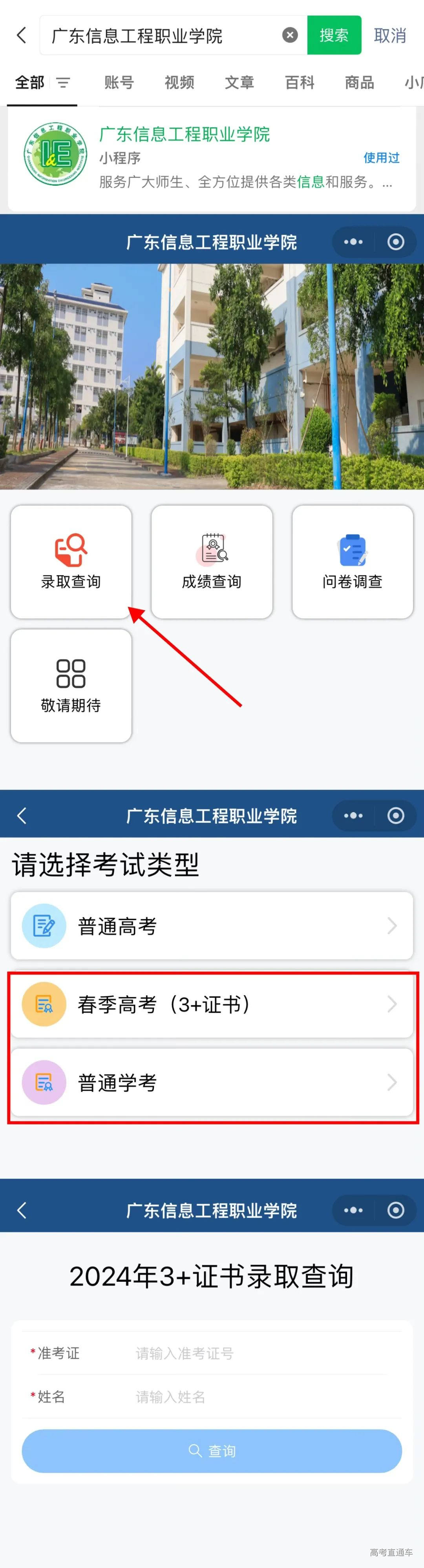 省教育考试院将通过号码10639678、106904886或106903335678短信向已录取考生在高考报名时绑定的手机号码推送录取结果,请考生注意查收。 1 2 可通过搜索“广东信息工程职业学院”微信小程序查询 考生可关注广东省教育考试院微信公众号(gdsksy),在页面底部选择“小程序”栏,通过考生号和密码登录查询录取结果。 3 4 可通过搜索”广东信息工程职业学院官网“招生就业栏”选择招生信息-进行录取查询 温馨提示: 考生查询小程序发现“未查询到相关信息”不代表你没被录取,只是录取信息还没反馈。有些学校的数据可能上传慢,考生如果实在着急,可以先去所报院校的官方网址进行查看。 因各高校录取时间不一致,有些快,有些慢,录取结果不是一次性公布,都可以在补录前查询,如果在录检结束后,还没查询到录取!那就要准备参加补录了。 因此,建议第一次投档尚未被录取,或者此前未达到省控线(190分)的考生重点留意补录消息,参加补录! 我校今年春季学考普通类及3+证书类均有补录计划哦~敬请关注广东省教育考试院发布的补录信息,及时填报。 我校录取咨询电话:0758-3630618 0758-3630628