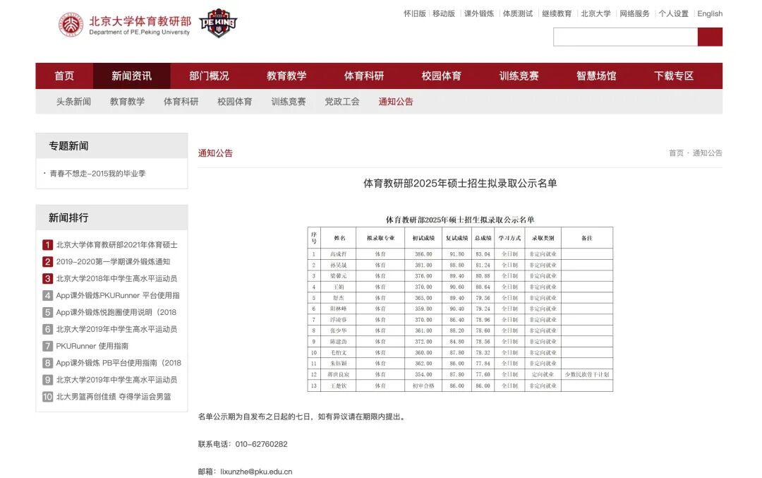 4月2日,北京大学体育教研部网站公布了2025年硕士招生拟录取公示名单。名单中出现了王楚钦的名字,表格显示初审合格,复试成绩86分,总成绩86分。