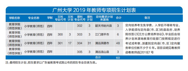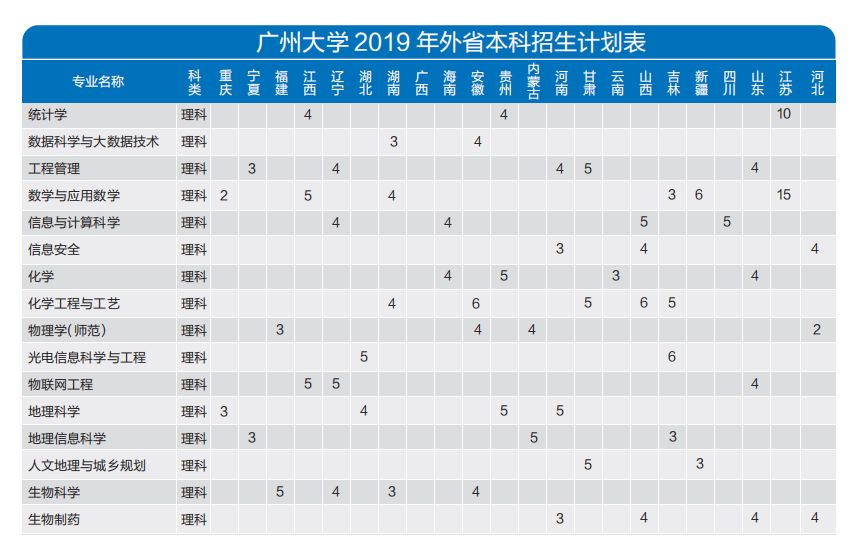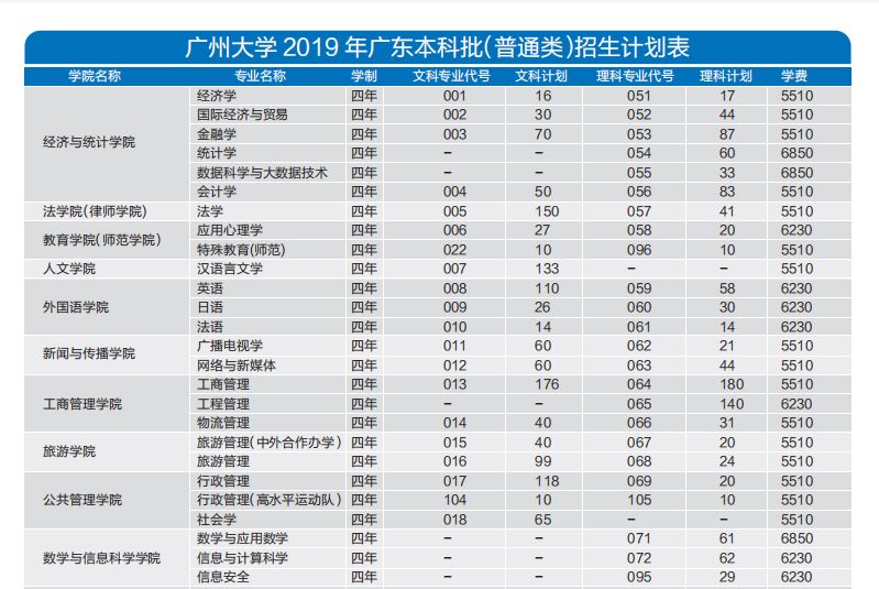 2019年我校普高招生本科计划数为 7580人,招生专业为 65个,我校生源计划充裕,专业门类齐全。今年新增专业有网络 空间安全、生物制药。对于报考广州大学的优秀考生,出档后,只要符合录取条件、服从所有志愿调剂,我校概不退档,保证录取。