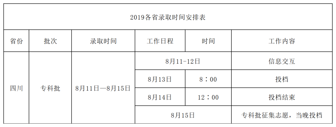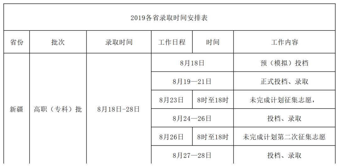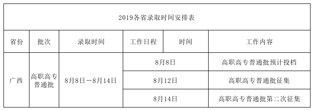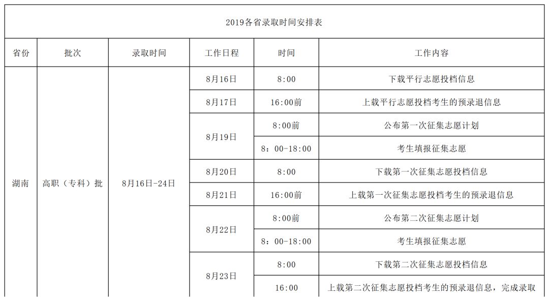 2019年 各招生省份录取日程 01 广东 2019年录取时间安排表 02 河南 2019年录取时间安排表 03 广西 2019年录取时间安排表 04 江西 2019年录取时间安排表 05 甘肃 2019年录取时间安排表 06 四川 2019年录取时间安排表 07 湖南 2019年录取时间安排表 08 山西 2019年录取时间安排表 09 新疆 2019年录取时间安排表 10 海南 2019年录取时间安排表