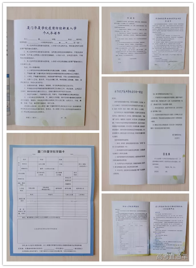 有同学问“录取通知书是不是薄薄的一页纸呢?”, 答案是“NO”, 你们会收到一个超级豪华大礼包哦 下面我们一起来看看这份超级豪华大礼包 里面都有什么吧? 录取通知书 这则录取通知书为我们 相逢于华厦学院铺上一条花路, 我们即将携手开启新的征程。 邮政封套 蓝天白云下国旗与校旗迎风飘扬, 教学楼、柯朝阳体育馆、办公楼 围绕田径场挺拔屹立, “勤学、修德、明辨、笃实”是学校校训, 是练就过硬本领的魔法棒。 外页 绿叶拥簇, 三角梅红艳, 白鹭报喜展现我校朝气与生机, 钟楼时间刻表面向四方, 就像我校学子对各领域知识的崇敬与渴求。 内页 注册联 珍藏联 学校简介 一则用于报到 两则用心收藏 2020新生报到指南 准备好迎接属于你们的大学生活了吗? 跟着这份报到指南走, 保你顺利无忧, 为了欢迎你们的到来, 我们做好了准备, 快打开看看吧 2020年招生简章 带你一站式了解学校和专业, 还有学长学姐的优异表现。 银行卡 少带现金,多安全,电子支付也方便! 国家资助,助你飞翔 无忧入学,在求学路上为你排忧解难 家校联系手册 一册在手,安全你有! 请仔细阅读,防疫防骗,你是最棒的! 记得要填哦! 当然了,后面的内容也不容错过! 2020年福建省征兵手册 有安全大国,才有安稳小家, 集美,欢迎您!