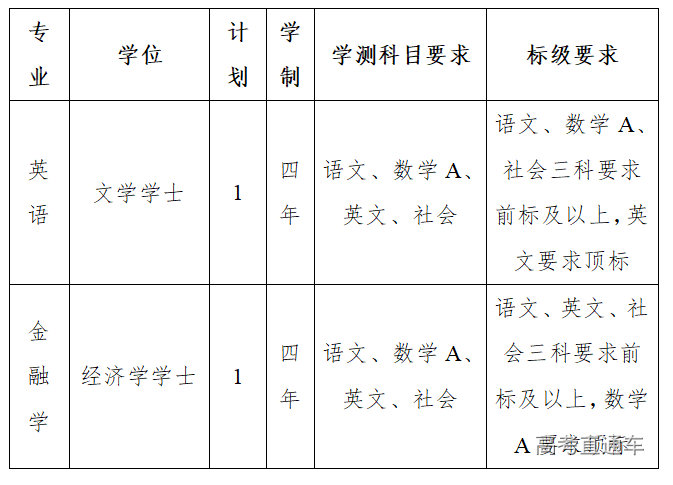 第七条 参加2024年台湾地区大学入学考试学科能力测试(以下简称“学测”),各招生专业学测科目和相应标级要求见第三章招生计划。