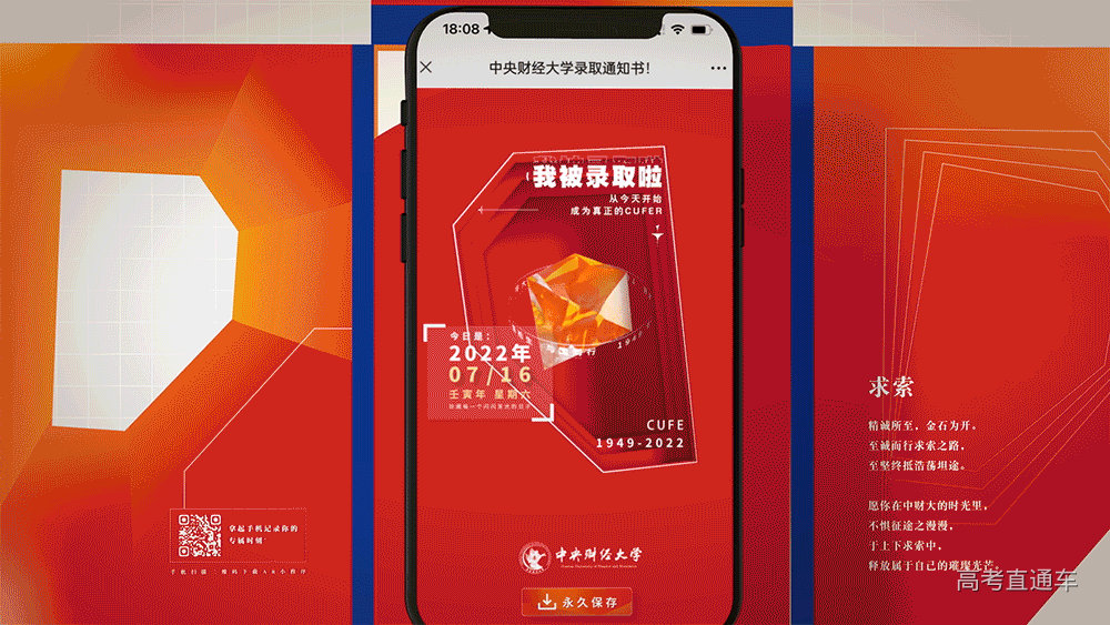 这是中财大首次在录取通知书中应用AR技术,设计团队利用的科技手段既增强金石的真实感,也满足各位“财宝儿”与亲友分享和传递喜悦的需求,还不快来晒出你的高光时刻!