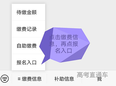 3、进入“报名缴费”页面,点击“收费项目”,选择要缴的相应项目,然后再填缴款人、证件号等相应的信息,填完信息后点击支付付款,如下图: