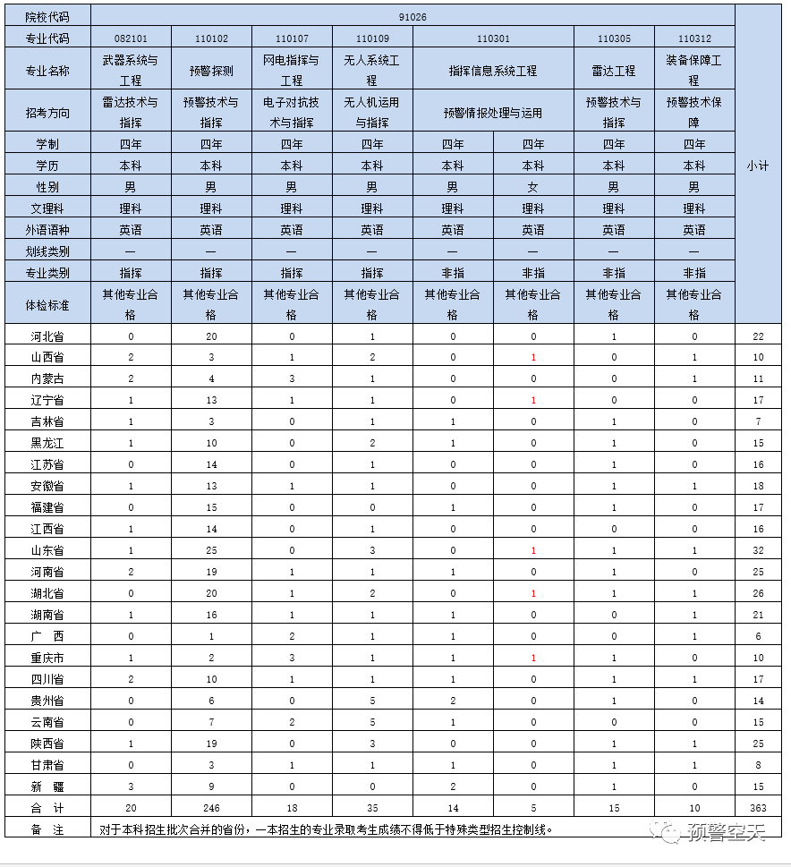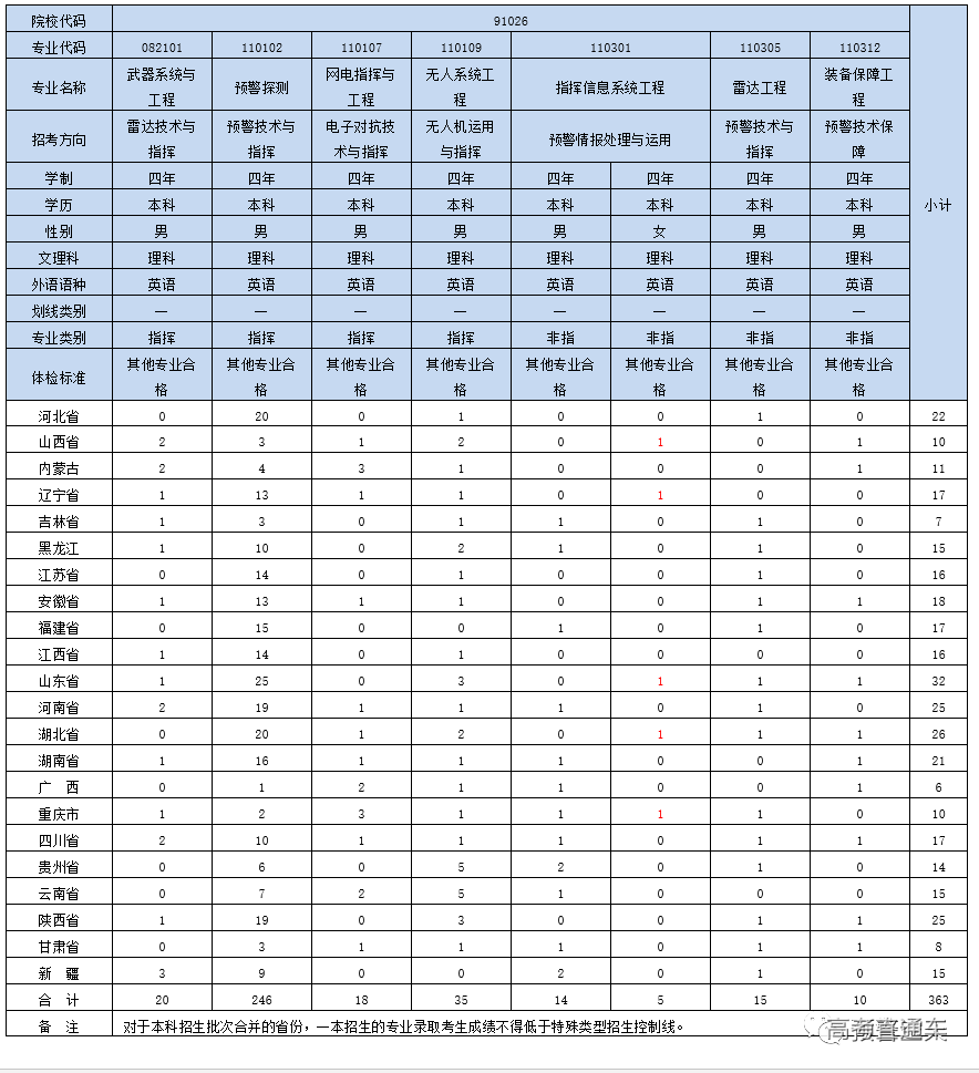 经教育部和中央军委批准,我院2020年面向22个省份(直辖市、自治区)招收7个专业及报考方向共363名理科高中毕业生。