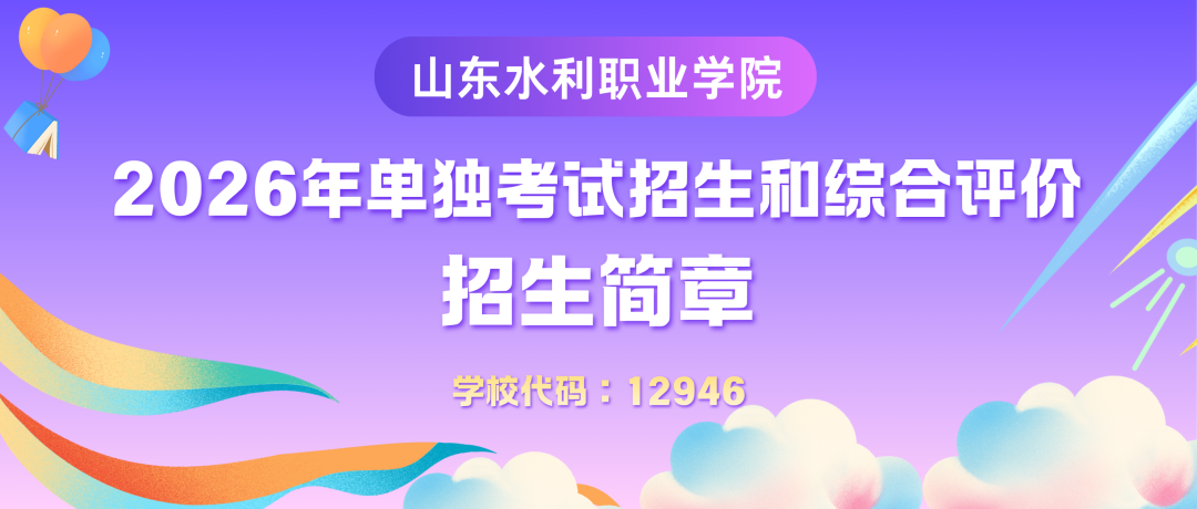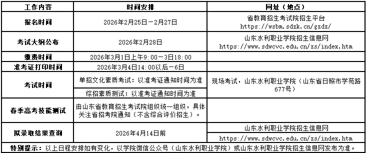 一、学校简介 山东水利职业学院是一所省属公办全日制普通高校,是以水利为特色,以工科为优势的高职院校,具有68年职业教育办学历史。学校始终坚持“以人为本、以水为魂”的办学理念,恪守“上善若水、海纳百川”的校训,秉承“根植水利行业办学、服务行业高质量发展”的理念,为社会输送了大批“懂技术、精技能、善创新”的高技能人才。 学校品牌: 全国优质水利高等职业院校 全国水利高等职业教育示范院校 全国职业院校魅力校园 国家级职业教育教师教学创新团队立项建设单位 国家级示范性职业教育集团(联盟)培育单位 国家级现代学徒制试点建设单位 山东省“双高计划”建设学校 山东省优质高等职业院校 山东省技能型人才培养特色名校 学校荣誉: “全国水利行业技能人才培育突出贡献奖” “全国水利职工教育先进集体” “山东省教育信息化示范单位” “山东省高校就业工作优秀院校” “山东省德育工作优秀高校” “山东省校园安全工作先进单位” “山东省教育网络安全工作先进单位” “山东省高校体育优秀单位” “山东省节水型高校” “山东省绿色学校” “智慧教育示范校建设单位”等 二、报名条件 考生必须通过山东省2026年普通高校招生考试报名后,方有资格报考我校单独考试招生或综合评价招生。 1.单独招生 面向山东省中等职业学校应届毕业生和社会人员,社会人员报考应取得高中阶段教育毕业证书或具有同等学力。 2.综合评价招生 面向山东省普通高中应届毕业生。 3.免试考生报名 免试考生资格认定以山东省教育厅公布的2026年单独招生免试考生报考条件和公布的具有免试资格学生名单为准(有关事宜详见学校招生信息网通知)。 4.报考运动专长类考生报名 必须具有田径、排球、乒乓球、武术套路及散打、健美操、羽毛球、篮球、足球运动专长,且有报考运动项目及小项对应的国家二级及以上运动员技术等级称号或高中阶段获得报考项目省级比赛单项前3名、集体项目前6名以及全国比赛单项前6名、集体项目前8名成绩(等级称号、比赛成绩获得日期为2026年2月10日前)。(有关事宜详见学校招生信息网通知) 三、招生计划 如需详细了解各专业特色、培养方向及发展前景,欢迎扫描下方二维码,或登录山东水利职业学院招生信息网,进入“招生动态”栏目,查看《2026年单独招生和综合评价招生专业解读》专题内容。 四、报名时间 报名时间为2026年2月25日—2月27日,考生需登录山东省教育招生考试院招生平台选报学校和专业(网址:https://wsbm.sdzk.cn/gzdz/)。选择我校及一个专业志愿,无服从调剂选项(每位考生仅能选择1所学校报名)。 五、考试大纲 预计在2026年2月28日在学院招生信息网公布。 六、缴费及准考证打印 报名结束后,2026年3月1日上午9:00—3日18:00,考生登录我校招生信息网(https://www.sdwcvc.edu.cn/zs/),进行缴费。学校2026年单独招生与综合评价招生考试费按照省发展改革委、省财政厅有关文件规定收取。缴费金额:单招报名考试费110元;综招无人机测绘技术专业(南方测绘订单班)、综招酒店管理与数字化运营专业(华住订单班)报名考试费80元,综招其他专业报名考试费均为70元。申请免试入学考生免收报名考试费。 七、考试安排 1.单独考试招生 2.综合评价招生 普通专业(不含无人机测绘技术专业南方测绘订单班、酒店管理与数字化运营专业华住订单班): 无人机测绘技术专业(南方测绘订单班): 酒店管理与数字化运营专业(华住订单班): 八、单招综招工作进程安排 校园图览