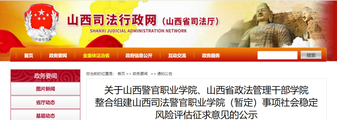 近日,山西省司法厅发布公示,为进一步优化司法行政系统职业教育资源配置,推动山西省法治人才培养工作高质量发展,根据《山西省“十四五”高等学校设置规划》,经研究决定将山西警官职业学院、山西省政法管理干部学院整合组建山西司法警官职业学院(暂定)