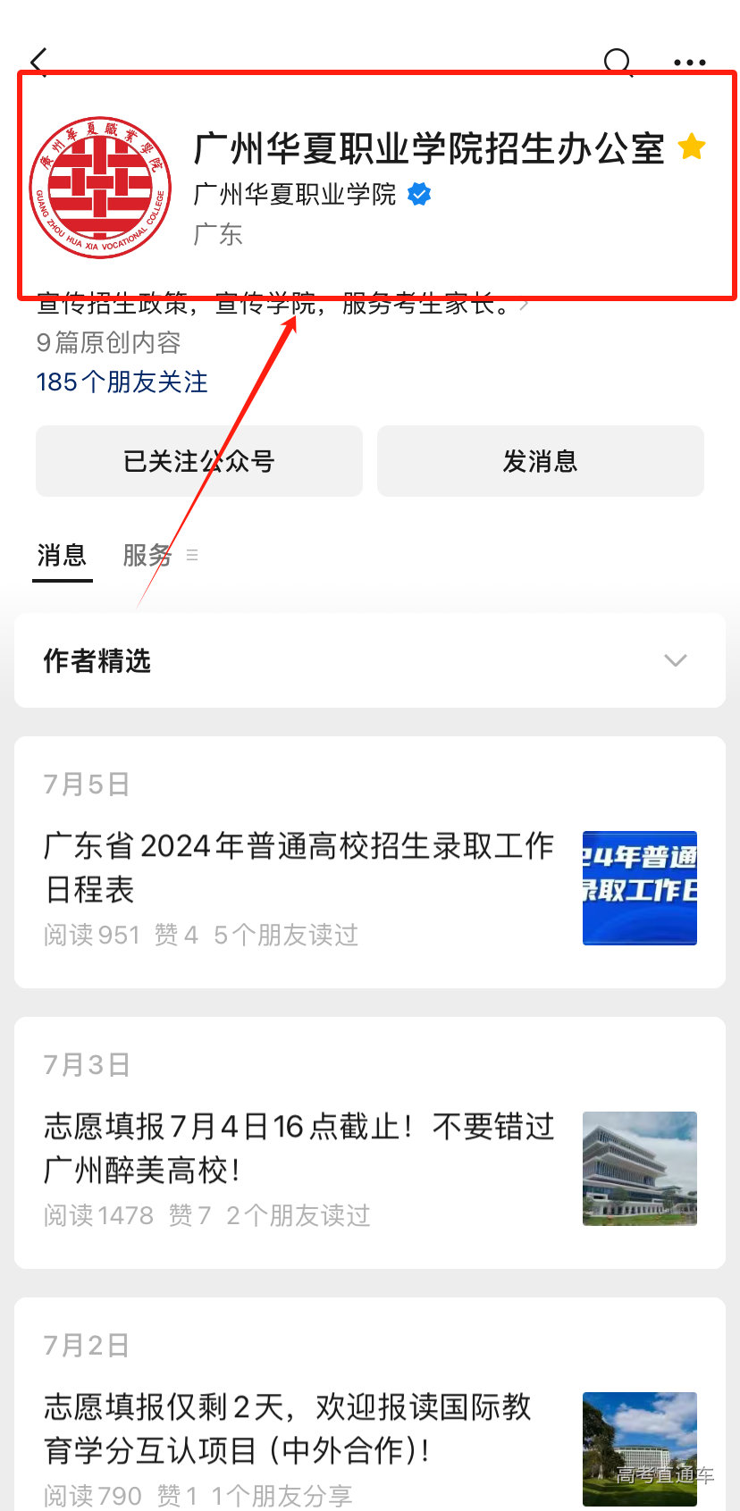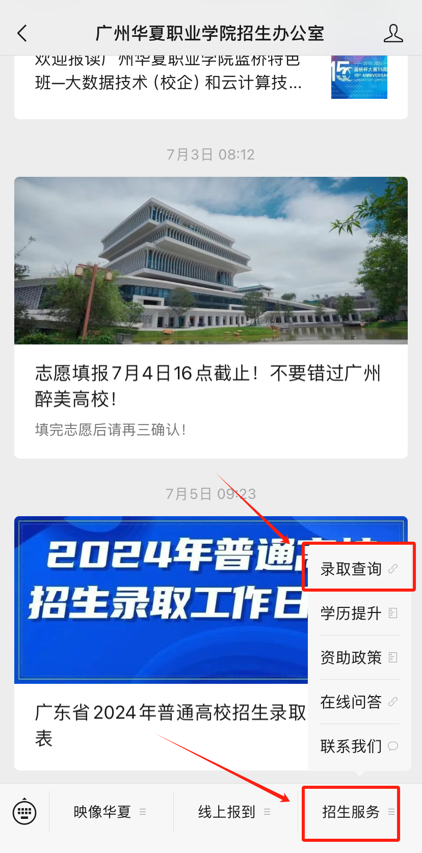 方式1 关注“广州华夏职业学院招生办公室”公众号,点击菜单栏【招生服务】—【录取查询】,输入准考证号,即可查询。