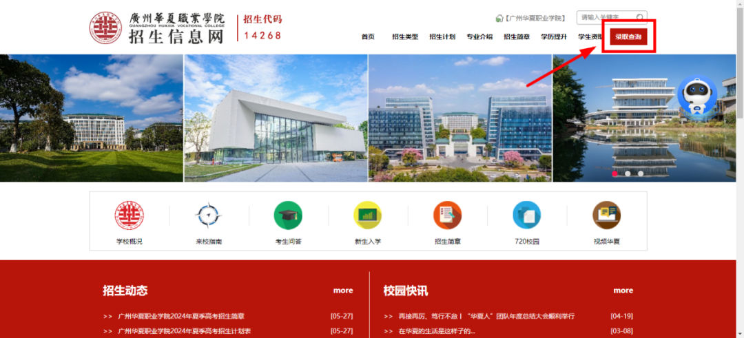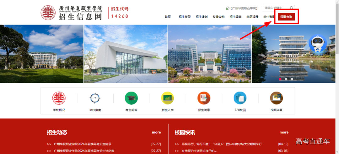 方式2 进入广州华夏职业学院招生信息网官网:http://zsw.gzhxtc.edu.cn/,点击【录取查询】栏目—输入准考证号即可查询。