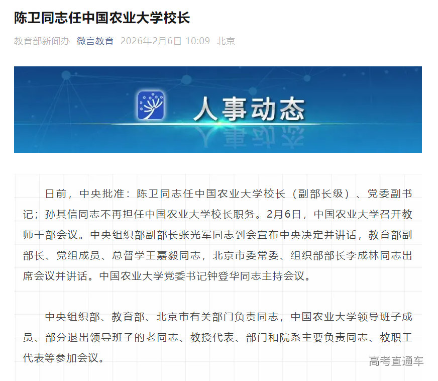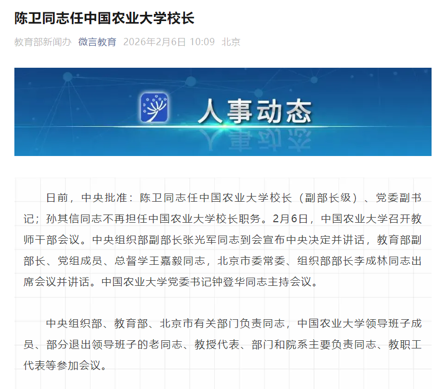 日前,中央批准:陈卫同志任中国农业大学校长(副部长级)、党委副书记;孙其信同志不再担任中国农业大学校长职务。2月6日,中国农业大学召开教师干部会议。中央组织部副部长张光军同志到会宣布中央决定并讲话,教育部副部长、党组成员、总督学王嘉毅同志,北京市委常委、组织部部长李成林同志出席会议并讲话。中国农业大学党委书记钟登华同志主持会议。