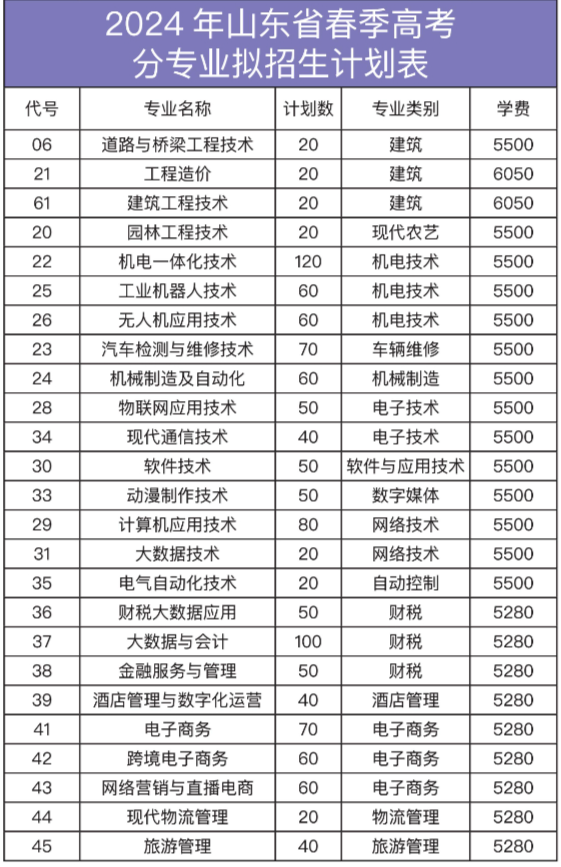 招生计划 7个专本贯通专业与山东农业大学、临沂大学、齐鲁师范学院、菏泽学院、山东体育学院、枣庄学院、济宁学院衔接培养人才夏季高考分专业拟招生计划表春季高考分专业拟招生计划表高职技师合作培养专业拟招生计划表学校介绍