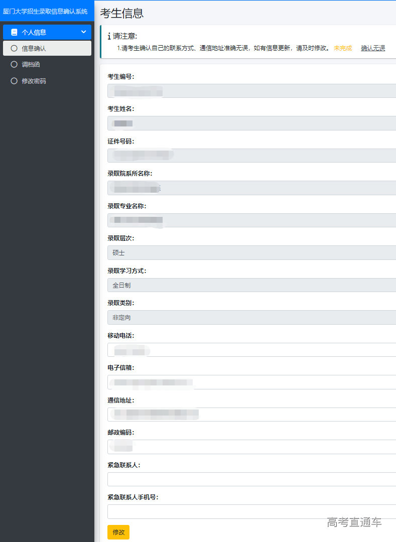 考生务必在7月24日前确认个人联系方式,以确保录取通知书等材料顺利邮寄,逾期修改无效。