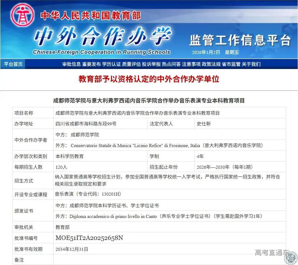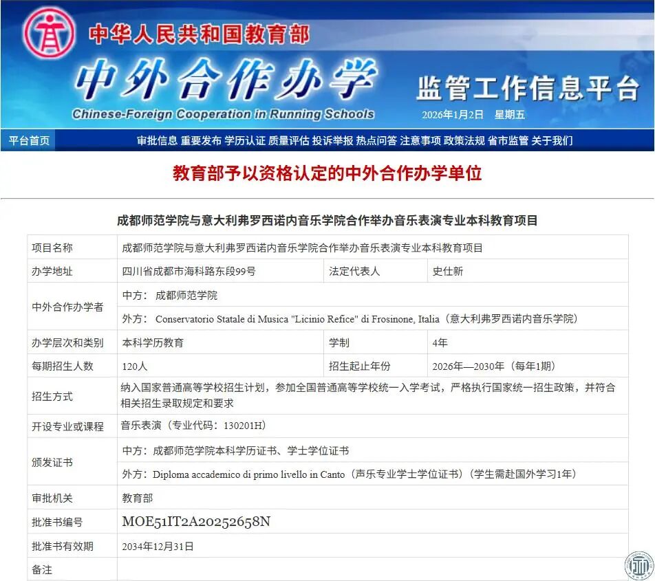 12月31日,教育部正式批准成都师范学院与意大利弗罗西诺内音乐学院(Conservatorio di Musica di Frosinone)合作举办音乐表演专业本科教育项目。这是我校首个获批的中外合作办学项目,也是四川省首个音乐表演专业本科层次中外合作教育项目,是学校国际化办学进程中具有里程碑意义的重大突破,标志着学校在服务国家和四川省数字经济高质量发展、培养国际化应用型人才方面迈入新阶段。 该项目学制四年,纳入国家普通高等教育招生计划,将于2026年9月正式启动首届招生。项目采用“3+1”培养模式,学生前三年在成都师范学院进行基础课程与专业核心课程学习;第四年前往意大利弗罗西诺内音乐学院。学生入学后同时注册为中意两校在籍学生,修业期满且符合双方毕业和学位授予条件者,可同时获得成都师范学院授予的本科毕业证书和艺术学学士学位,以及意大利弗罗西诺内学院授予的艺术学学士学位。双学位认证将为学生升学深造、跨国就业及职业发展拓宽路径,助力其成长为音乐表演领域的高素质专业人才。 意大利是享誉世界的古典音乐发源地与艺术文化重镇,音乐教育体系传承悠久、底蕴深厚,在全球音乐艺术领域地位举足轻重。弗罗西诺内音乐学院是意大利拉齐奥大区极具影响力的公立音乐院校,获意大利教育、大学与科研部(MIUR)最高等级资质认证,且列入中国教育部教育涉外监管信息网认可名单,形成中欧双权威质量保障体系。该校凭借扎实的学科建设与鲜明办学特色,连续多年跻身意大利《共和国报》“中部地区音乐院校综合实力TOP5”。本次中意合作办学将嫁接两国顶尖音乐教育资源,构建“本土化筑基 + 国际化深造”双轨培养体系,融合意大利成熟的古典音乐教学范式、舞台实践机制与我校应用型人才培养优势,为学生打造兼具专业深度与国际视野的成长平台。合作不仅填补四川省音乐表演专业本科层次中外合作办学空白,更能推动中意音乐艺术领域的学术交流、师生互访与作品共创,助力我校在“十五五”期间建成西部有影响力的国际化艺术人才培养基地。 该项目的成功获批,为学校深化国际交流合作开辟了全新赛道。学校将以该项目为引擎,持续贯彻开放国际发展战略,拓展与全球高校在人才联合培养、科研协同创新、师生双向流动等领域的深度合作,全面提升国际化育人水平,为学校“十五五”期间的高质量发展注入强劲动能。
