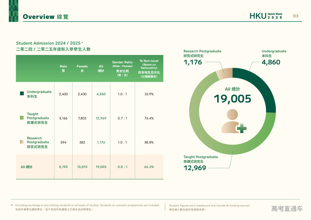 2024/2025学年,港大新入学学生总数达到了19,005人,其中本科新生人数为4,860人,其余均为研究生。可见,研究生占据了大多数,展现了港大在研究生教育方面的深厚实力。