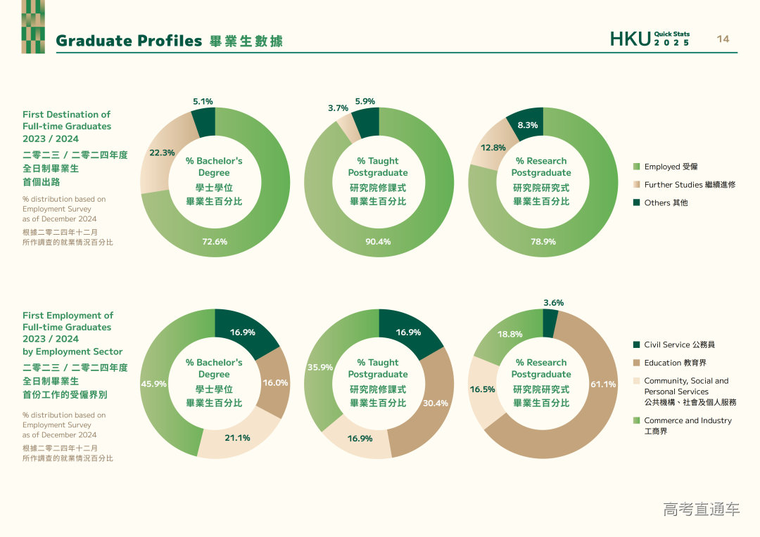 投身职场的毕业生遍布各行各业,包括工商企业、公共部门、社会服务、教育领域等。以上数据不仅显示了港大学子的高竞争力,也表明他们在职场上的多样化发展。