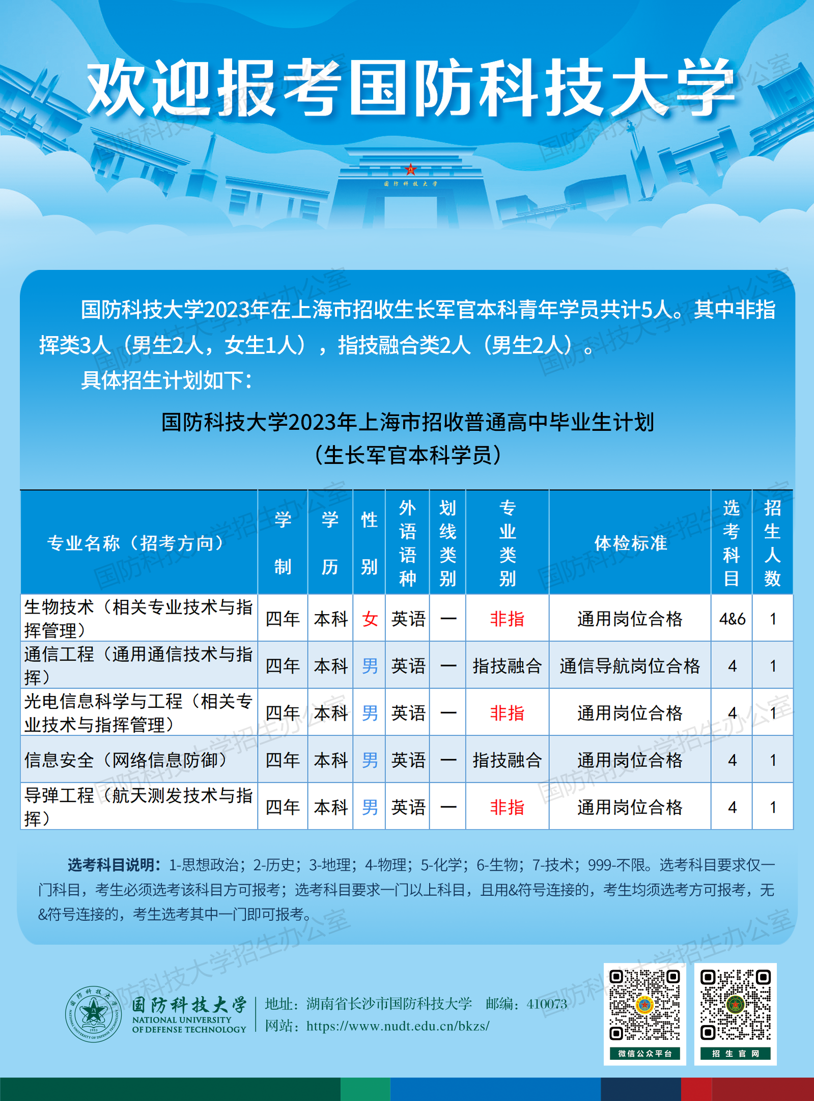 国防科技大学2023年生长军官本科学员招生计划(上海)