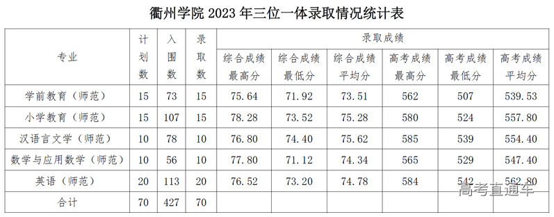 根据《衢州学院2023年“三位一体”综合评价招生章程》规定,今年我校录取学前教育(师范)、小学教育(师范)、汉语言文学(师范)、数学与应用数学(师范)、英语(师范)专业三位一体新生共70名。其中,学前教育(师范)综合成绩最高分75.64分,最低分71.92分;小学教育(师范)综合成绩最高分78.28分,最低分73.52分;汉语言文学(师范)综合成绩最高分76.80分,最低分74.40分;数学与应用数学(师范)综合成绩最高分77.80分,最低分71.12分;英语(师范)综合成绩最高分76.52分,最低分73.20分。各专业录取综合成绩和高考成绩均保持稳定。