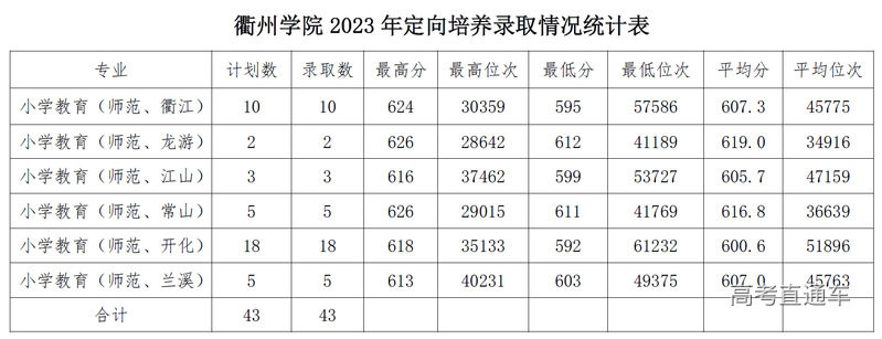 今年我校面向衢江区、龙游县、江山市、常山县、开化县、兰溪市定向培养小学全科教师共43名。其中,录取衢江籍考生10名,最高分624分,最低分595分;录取龙游籍考生2名,最高分626分,最低分612分;录取江山籍考生3名,最高分616分,最低分599分;录取常山籍考生5名,最高分626分,最低分611分;录取开化籍考生18名,最高分618分,最低分592分;录取兰溪籍考生5名,最高分613分,最低分603分。其中,录取最高分626分、位次28642,均创历史新高。