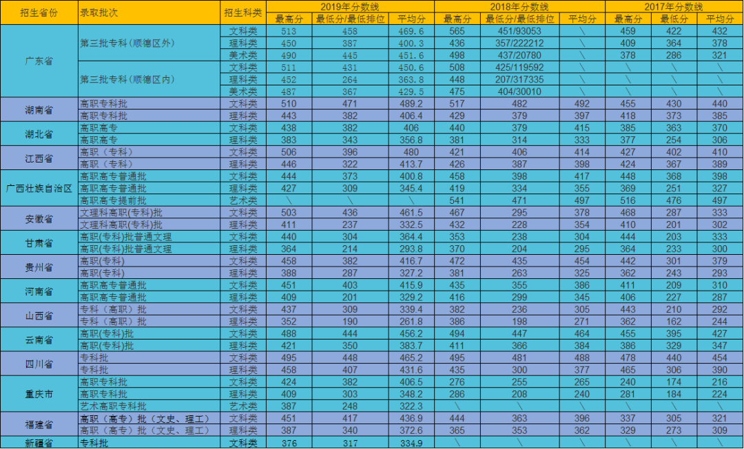 1、在省(区、市)招生委员会划定的录取最低控制分数线上,在确保完成招生计划的前提下,按照文科类、理科类、艺术类分类录取。 2、在广东省,报考本校普通专科层次普通类专业,文科类考生必须参加普通高中学业水平物理、化学、生物学3门科目的考试,理科类考生必须参加普通高中学业水平思想政治、历史、地理3门科目的考试,各门考试均须获得等级成绩;且普通类专业至少须有1门成绩达到C级及以上等级。具体要求以广东省当年招生录取工作文件为准。 3、在广东省,报考本校普通专科层次艺术类专业,参加高考文科类文化课考试的考生必须参加物理、化学、生物学3门科目普通高中学考,参加高考理科类文化课考试的考生必须参加思想政治、历史、地理3门科目的普通高中学考;且至少须有2门科目成绩达到D级及以上等级。 4、在实行平行志愿投档的省(区、市),本校可根据各省级招生办公室公布的平行志愿投档规则及生源情况确定招生计划微调方案和调档比例。 5、在思想政治品德考核和身体健康状况检查合格、统考成绩达到同批录取最低分数线,符合本校提档要求的情况下,依据考生成绩、专业志愿,以及本校录取原则择优录取。 6、文科类、理科类专业分档时,根据各省(区、市)投档规则出档后,实行“专业志愿优先”原则,根据考生填报专业志愿顺序,按考生投档总分排位情况从高到低排序录取。考生投档总分排位相同时,优先录取已修习相关专业基础知识(模块)的考生;没有排位或排位分的省(区、市),则依次按高考单科顺序及分数从高到低排序:文科类为语文、数学、外语、文科综合,理科类为数学、语文、外语、理科综合。 7、艺术类统考专业分档时,根据各省(区、市)投档规则出档后,在考生符合专业要求的基础上,实行“专业志愿优先”原则,根据考生所填报专业志愿顺序,按考生投档总分排位情况从高到低录取。考生投档总分相同时,按照考生排位择优录取。当考生排位相同时,优先录取修习相关专业基础知识(模块)的考生。 8、考生所填报的所有专业志愿均未被录取时,若服从专业调剂,按考生投档总分从高到低调剂到计划有空额且符合相关专业要求的专业录取;考生不服从调剂的,或服从调剂但是不符合计划有空额专业相关要求的,作退档处理。 9、本校公共外语教学为英语,非英语语种考生需慎重报考。 10、有关加分或照顾录取政策,在各省份执行各省(区、市)招生办公布的加分项目及分值。加分分值适用于投档及专业分档。符合国家和省(区、市)招生办公室公布的优录条件考生,本校在同等条件下优先录取。对考生学业水平成绩的要求,按各省(区、市)有关规定执行。 11、本校会计、酒店管理专业与广东财经大学会计学、酒店管理专业联合开展“三二分段专升本协同育人项目”。本校“三二分段专升本协同育人项目实验班”通过广东省夏季普通高考招收学生,与本校其他专业同批次录取,单独代码招生,单独编班。试点专业实验班学生按五年人才培养方案要求,完成三年高职学段学习,各项考核合格,并符合相关条件和要求的,获得本校普通高职(专科)毕业证书。通过转段选拔考核合格的实验班学生进入广东财经大学试点专业学习两年,符合相关条件和要求的,可获得广东财经大学普通本科毕业证书和学位证书。非实验班学生,不得转入试点专业实验班学习。 12、专业备注(广东省及外省招生专业通用): (1)夏季普通高考招生学制均为3年; (2)化工类专业(应用化工技术、工业分析技术、食品质量与安全、环境监测与控制技术)、医学类专业(药学、护理、康复治疗技术、老年服务与管理)、艺术类专业以及家具设计与制造专业不招色盲生。 (3)因用人单位对考生身高有要求,请男生身高低于165cm,女生身高低于155cm的考生慎重报考文秘、社会工作、旅游管理、会展策划与管理、酒店管理、烹调工艺与营养专业。 (4)市场营销(TAFE,中外合作办学)属于中外合作办学专业,只招收填报本专业志愿的考生。