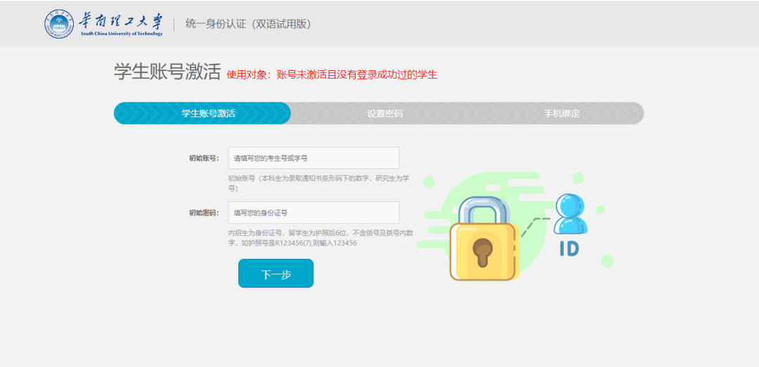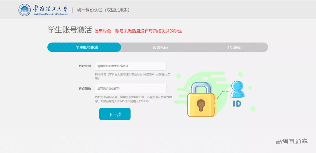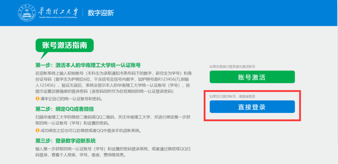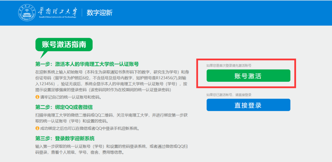 新生在首次登录迎新系统时,须通过网址https://freshman.scut.edu.cn在电脑或手机浏览器登录,激活学校统一认证账号,并设置高强度密码。