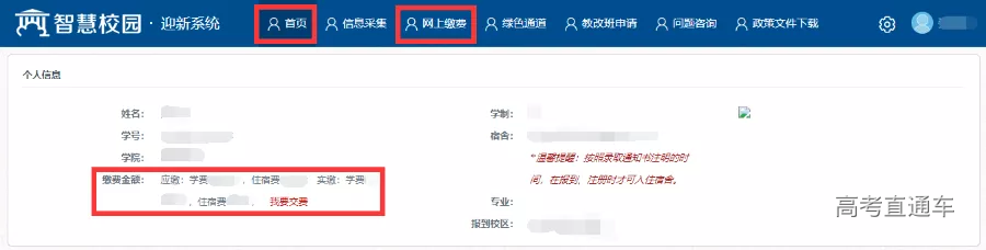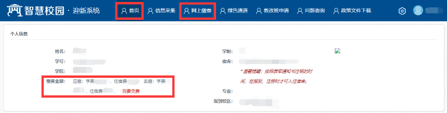 新生可以在迎新系统“首页”>“缴费金额”上获取到学费、宿舍费、体检费等待缴费信息,交费途径有二:一是点击“首页”>“缴费金额”的“我要交费”后,按网页提示可进行线上交费;二是点击“网上交费”按网页提示可进行线上交费。