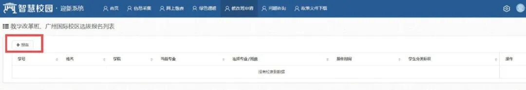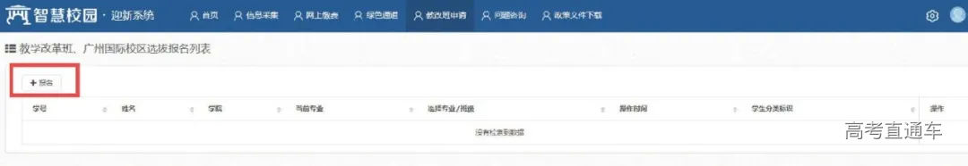 完成基本信息采集后,本科新生可以在迎新系统“教改班申请”>“报名”,进行教学改革班、广州国际校区选拔报名。