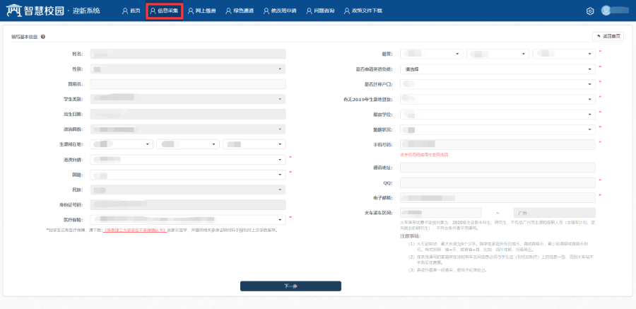 新生须按照学校要求填写:个人基本信息、家庭信息、个人健康档案、户口迁移信息(需迁移户口的新生填写,需上传户口迁移证扫描件)、已办理生源地信用助学贷款信息等数据,并完成教育部规定的艾滋病防治知识和“国八条”教育的学习内容。