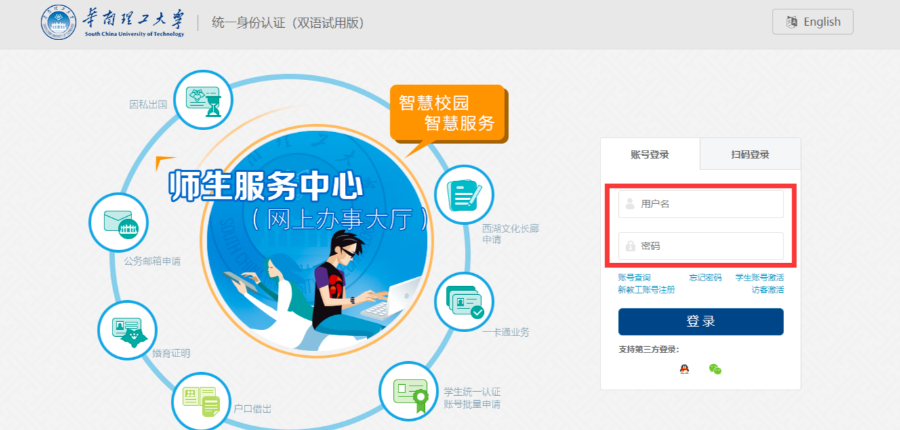 (4)扫描“入学须知”折页上的“华南理工大学企业号”二维码,并使用激活的统一认证账号绑定企业号。