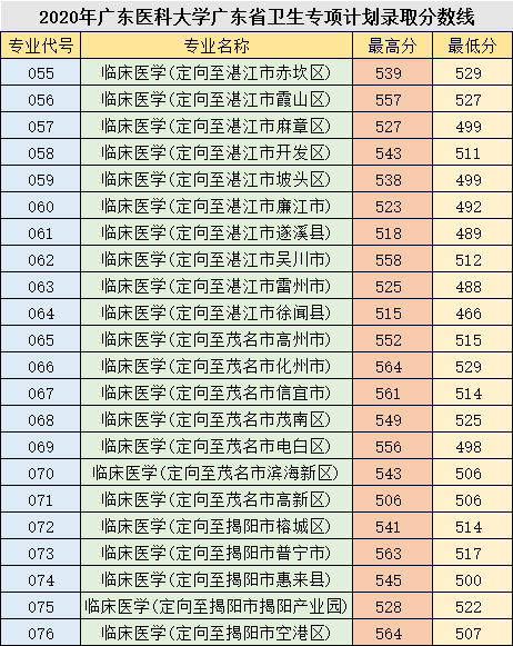 2020年我校广东省卫生专项招生计划242名,录取242名,今年卫生专项录取情况表现“两个特点”,一是专业志愿匹配度高,所有考生均为第一志愿录取,高出当地卫生专项控制线26分提档;二是最高分和最高排位较高,投档最高分564(比高分优先投档线524高出42分),排位42876,最低分466,排位148376。