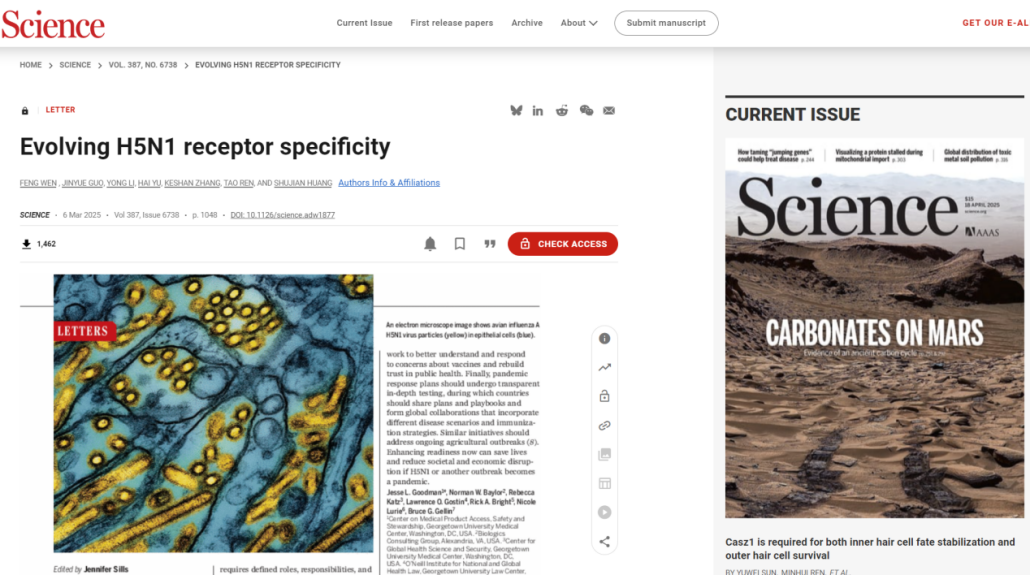 3月,佛山大学以第一单位在《Science》刊发题为“Evolving H5N1 receptor specificity”Letter文章。这一研究成果由佛山大学动物科技学院教授黄淑坚、张克山、温峰领衔完成,该文第一作者为佛山大学青年教师温峰教授。这是佛山大学首次作为第一通讯单位、佛山大学学者首次作为第一作者,在《科学》期刊发表研究成果。
