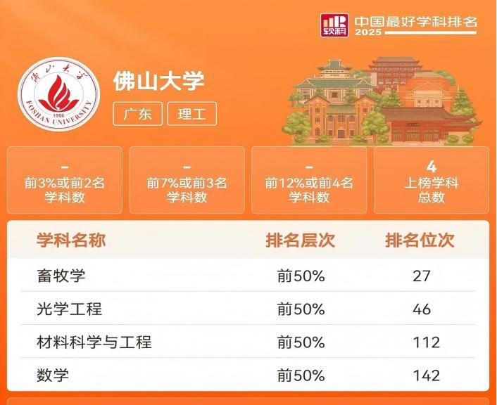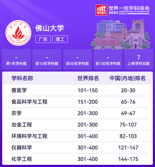 佛山大学在2025年软科世界一流学科排名中实现新跨越,上榜学科数量增至7个;在中国最好学科排名中新增2个上榜学科,彰显学校学科实力和学术影响力的持续提升。