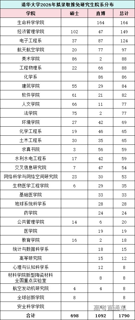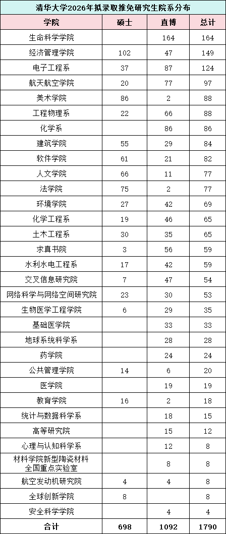 清华大学2026年各院系推免生拟录取名单陆续公示中,截至发文前,已有32个院系公布今年推免生拟录取名单,共拟录取1790人,其中硕士698人,直博1092人。其他院系正在陆续发布中。