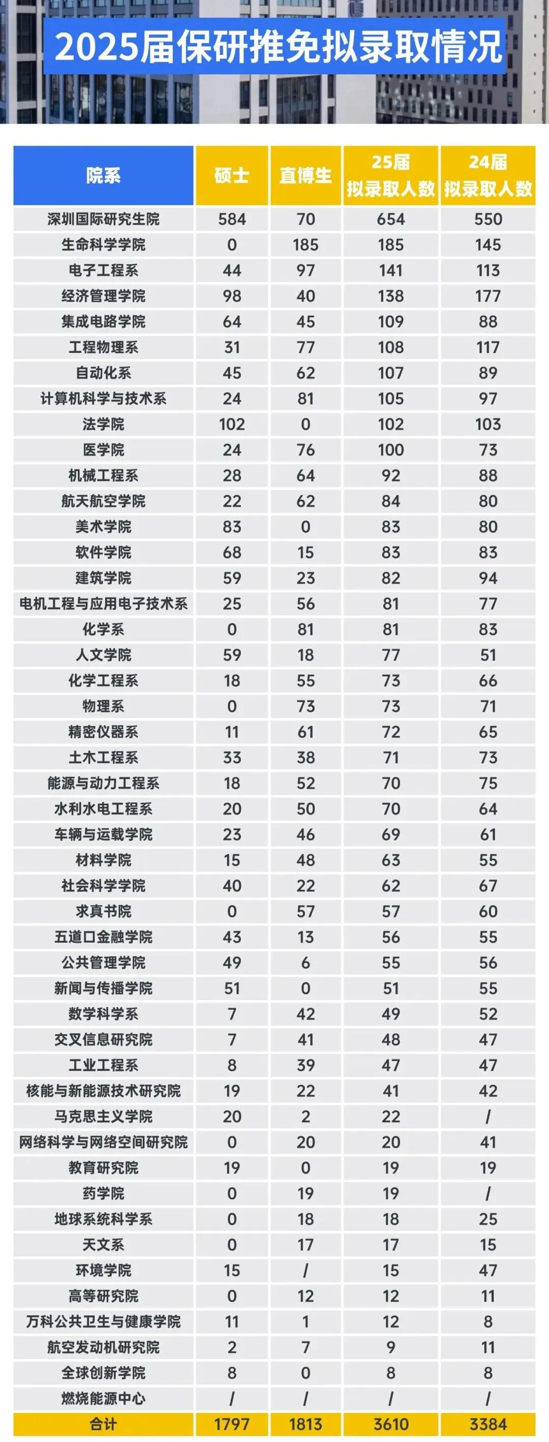 从具体院系来看,深圳国际研究生院在2025届招收的推免生数量最多,达到639人。紧随其后的是生命科学学院和电子工程系,分别招收了185人和141人。
