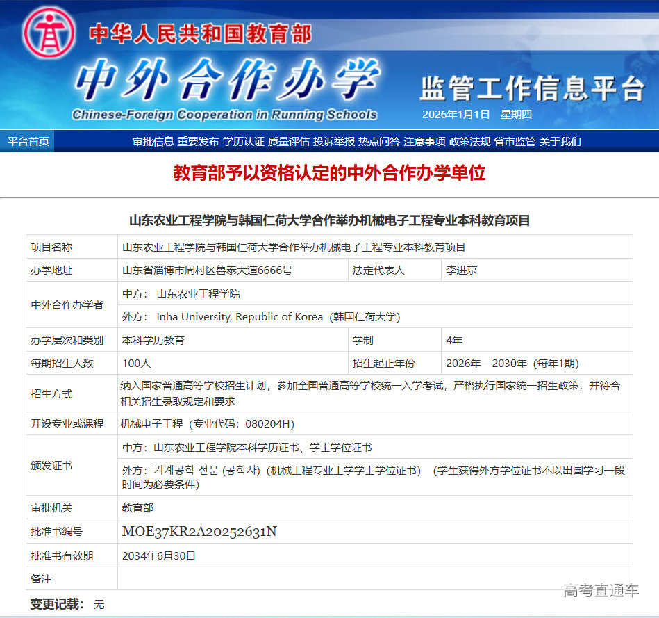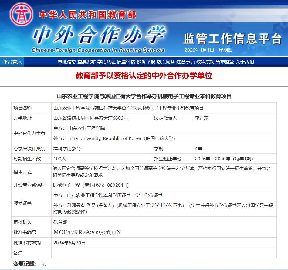 仁荷大学(Inha University)是韩国知名的研究型大学,韩国教育部BK21PLUS工程大学,LINC+产学合作优先大学,AACSB认证大学,素有“东方MIT”之称。与我校合作的机械工程专业在2025年QS学科排名中位列全球201-250区间,是该校的王牌专业之一,已获韩国工程教育认证(ABEEK)。此次合作将有效整合两校在工程领域的优质资源,共同培养具备国际视野、跨文化沟通能力与创新实践能力的高素质工程技术人才。 本项目计划于2026年启动招生,每年计划招收100人,学制4年,采用“4+0”双学位培养模式,学生完成规定课程且达到双方授予条件后,可同时获得我校本科毕业证书、学士学位证书以及韩国仁荷大学学士学位证书。未来,学校将进一步创新国际化办学机制,持续拓展与海外高水平大学在人才培养、科研合作、师资交流等领域的深度合作,提升涉外办学质量,为服务国家战略与区域发展培养更多具有全球竞争力的应用型人才。
