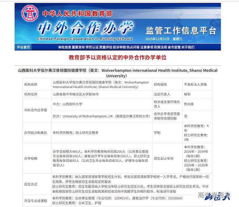 近日,教育部公布了2025年下半年中外合作办学机构和项目评审结果,我校与英国伍尔弗汉普顿大学合作设立的“山西医科大学伍尔弗汉普顿国际健康学院”正式获批。这是2003年《中华人民共和国中外合作办学条例》颁布实施以来,我省首个非独立法人中外合作办学机构,标志着我校国际化办学迈入全新阶段,也为山西高等医学教育对外开放注入强劲动力。