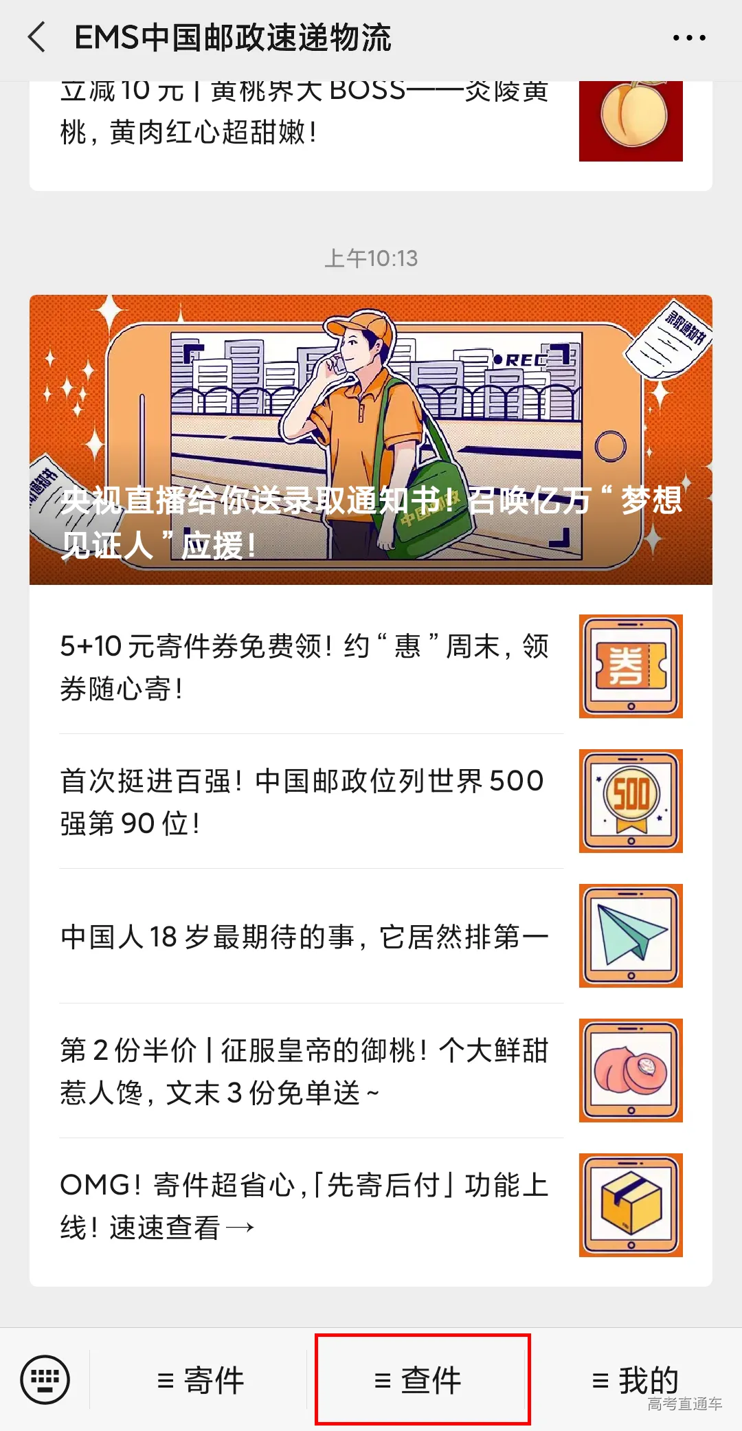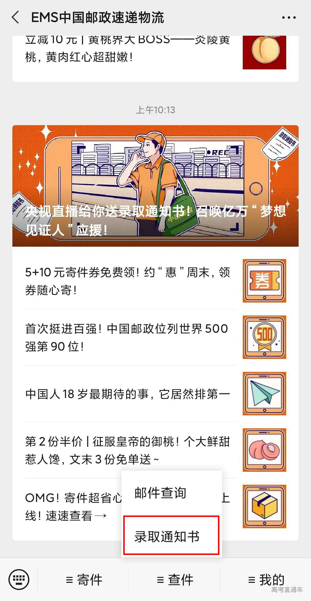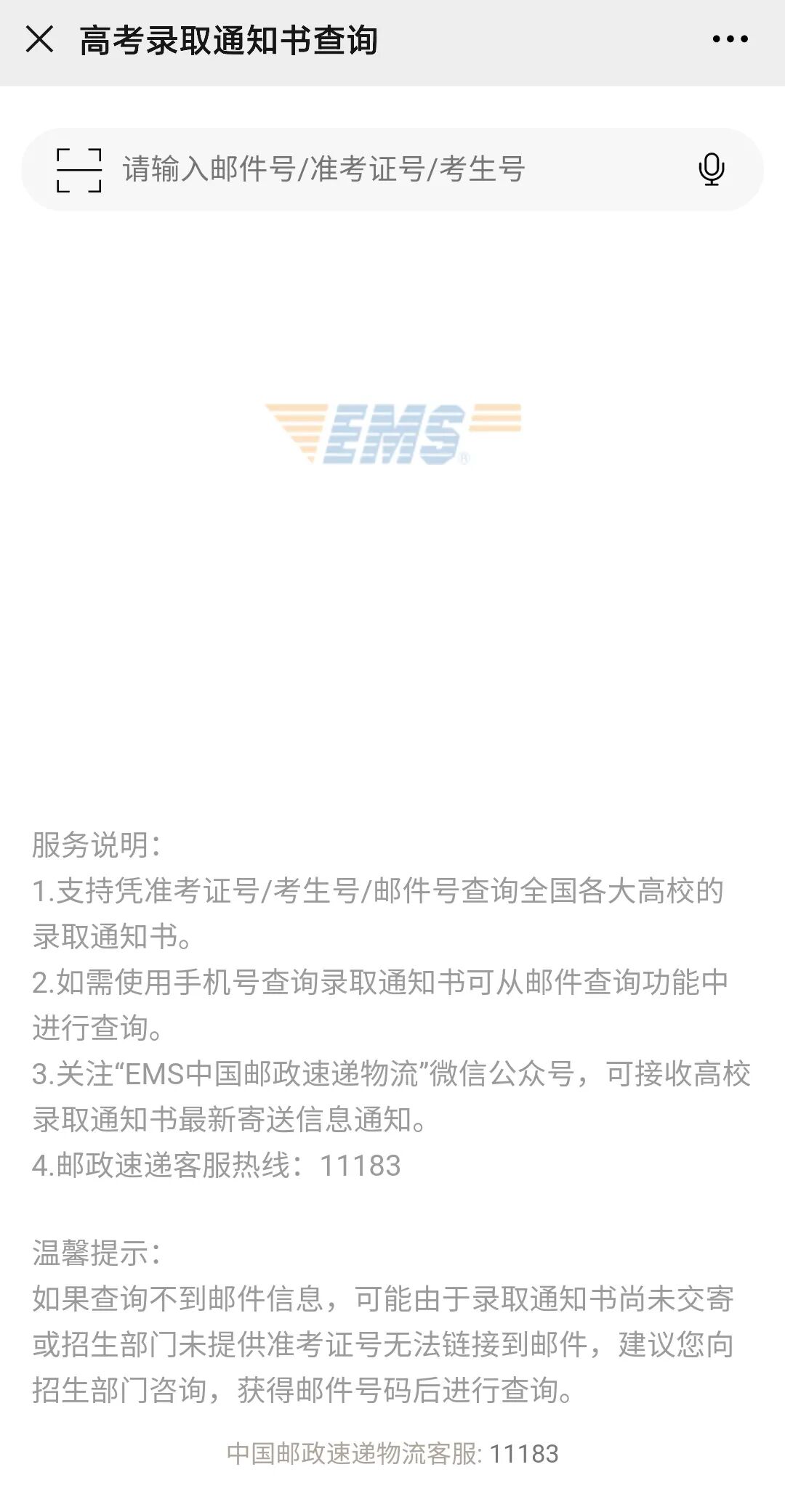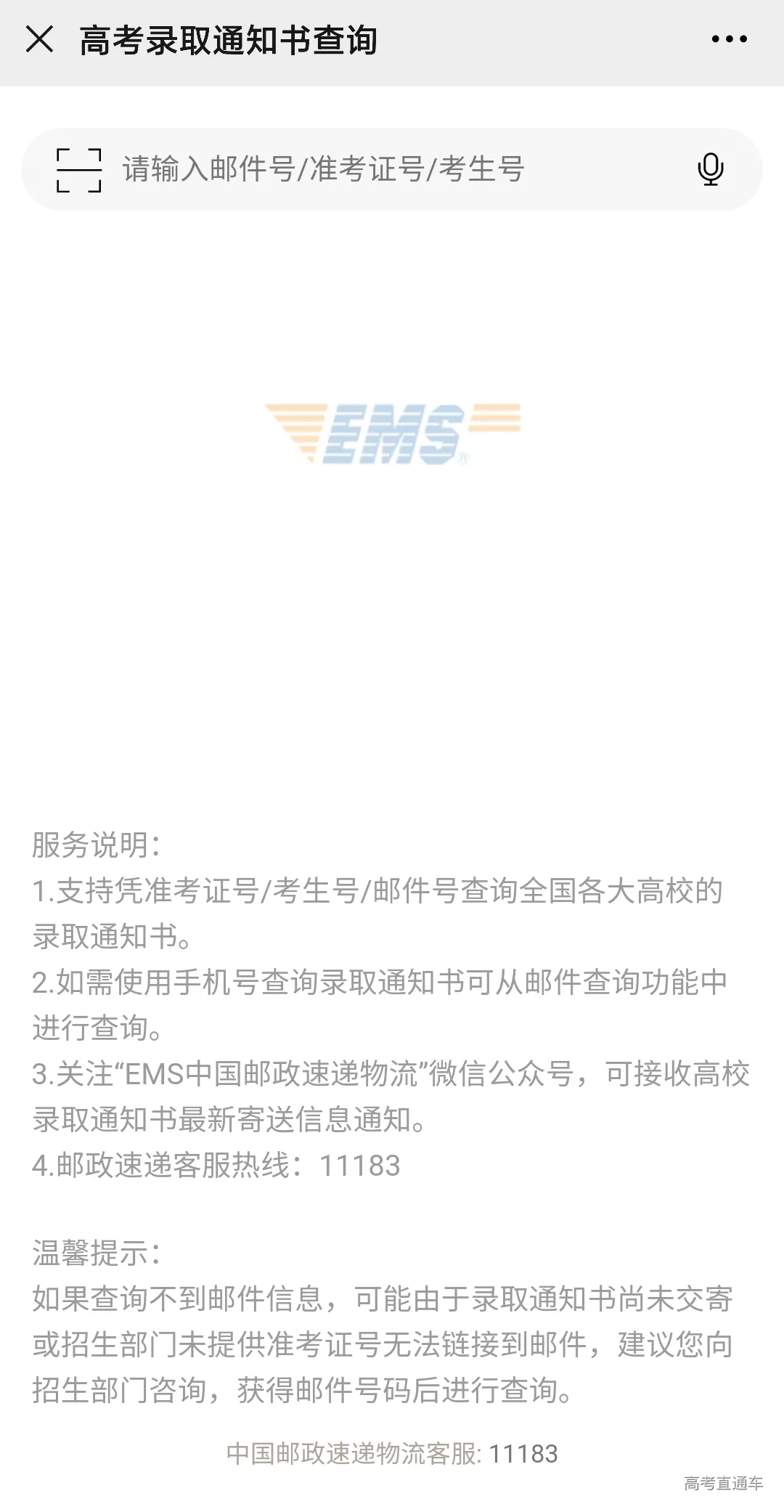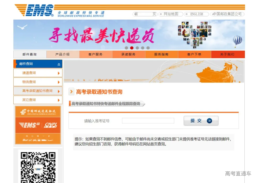 登录中国邮政速递物流官网录取通知书查询界面,输入准考证号即可查询。