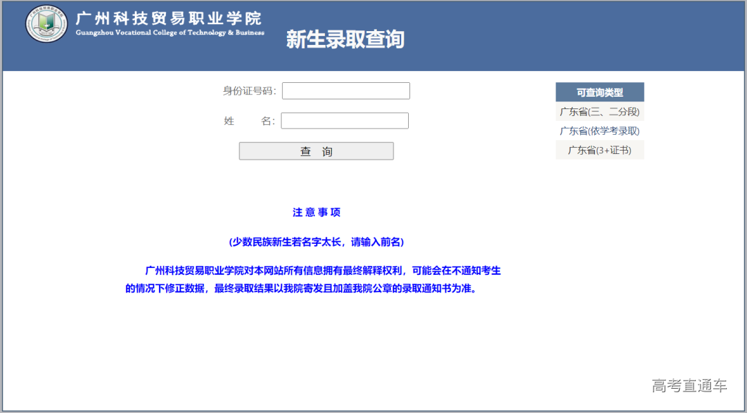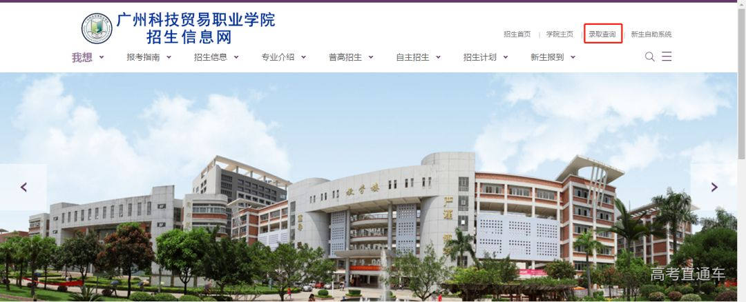 一、录取院校查询 二、录取专业查询 网站:http://zsw.gzkmu.edu.cn/ 进入广州科技贸易职业学院招生信息网,点击录取查询; 输入姓名和考生号(或准考证号或身份证号),点击查询。 关注广州科技贸易职业学院招生办,也可达到我院招生录取页面。 进入广州科技贸易职业学院招生办公众号,点击招生资讯——录取查询。 输入姓名和考生号(或准考证号或身份证号),点击查询。