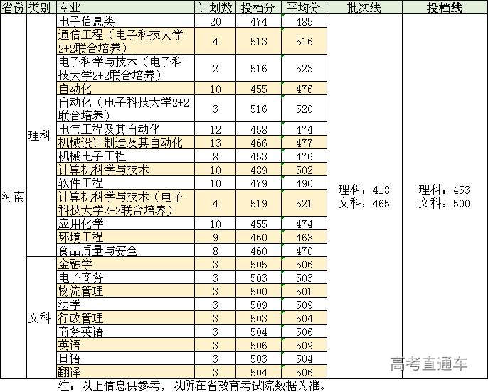 2020年电子科技大学中山学院在河南分专业录取分数线