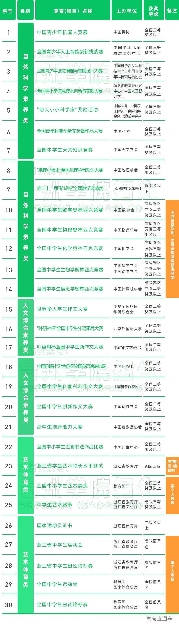 (五)素质特长考生条件:高中阶段在自然科学、人文、艺术、体育等方面取得突出成绩,经专家评审委员会认定,符合报考条件且符合以下3类条件之一的特长考生,直接获得所报测试组类的综合素质测试资格。如以团队形式获奖的仅认定第一顺序人。
